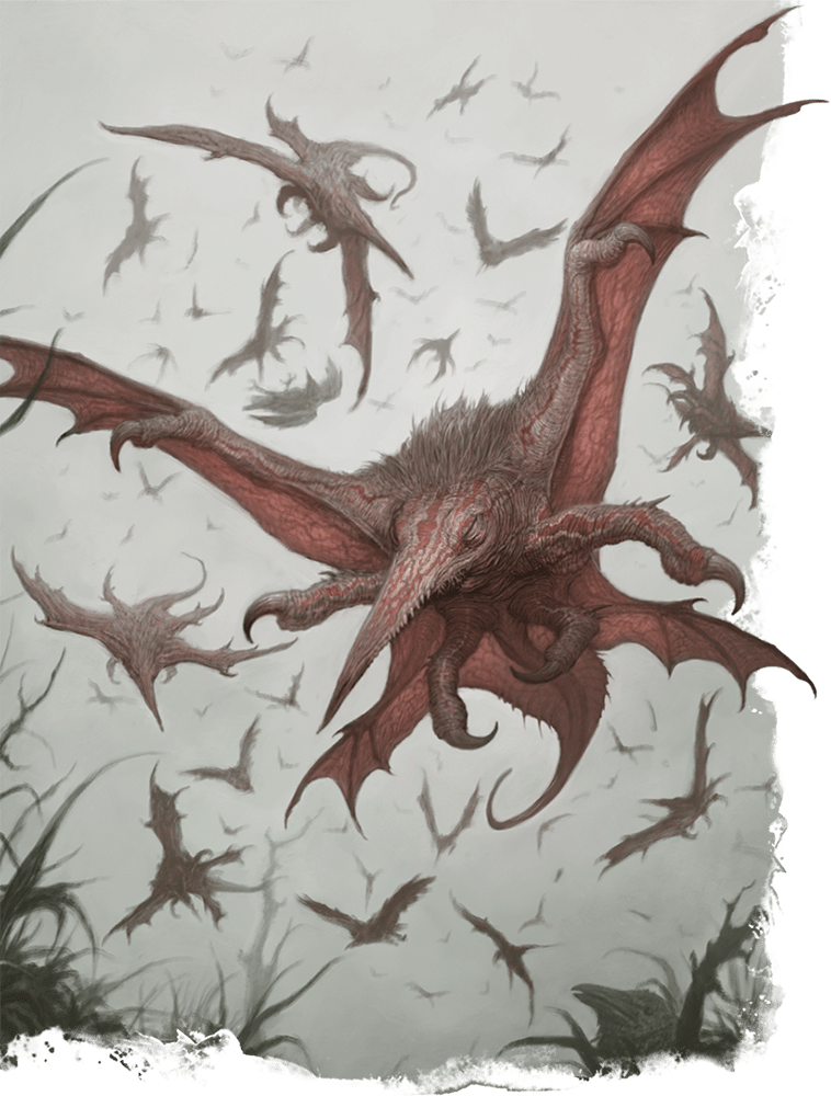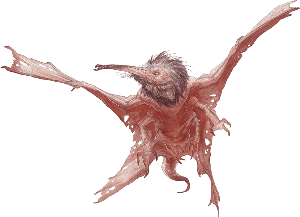 Are there other uses for Stirges, though, beyond just being a jump-scare when your players enter a dimly-lit space? In the Shadowfell, a morbid shade whispers that messages can be sent on the wings of blood-drinkers, their thirst guiding them home like vampiric carrier pigeons. Or a wizard who has a Stirge familiar – probably because he messed up the spell and that’s what he’s stuck with. They can serve as grotesque decoration in the dripping, cavernous halls of an Underdark monarch who is fascinated by the beauty of these pale, hairless parasites.