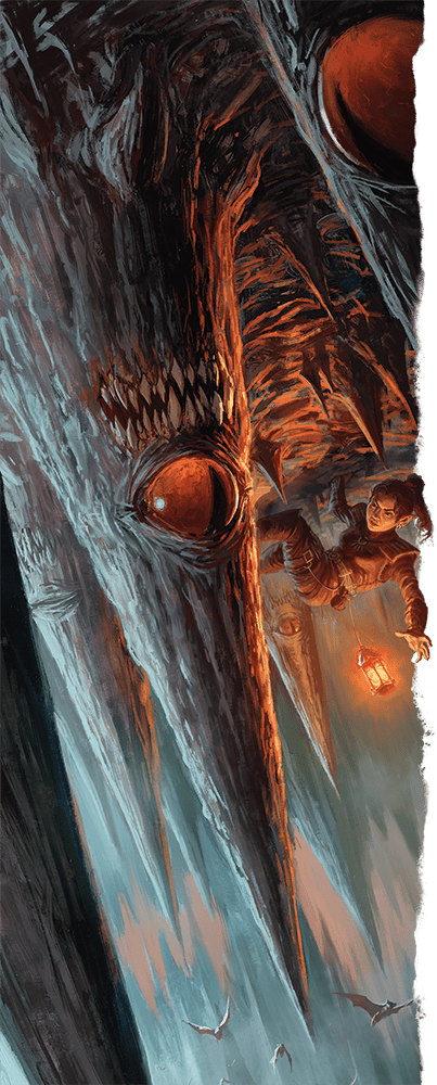 So how do you telegraph to them that there are things in the high darkness that they need to worry about? Skeletons in the cavern with giant holes in the skulls? Discarded, dented helmets? Crunching noises from up above that your players with the best passive perception can hear? Perhaps there is a hastily-scrawled sign at the entrance to the caves that simply reads, “NEVER LOOK UP.”