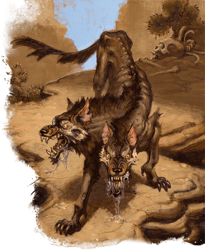 This skeletal, two-headed, doglike creature has a serpentine spine that coils far too long for its body. Its ribs grind as they shift, and bone fragments shed like scales when it moves. Each head bears empty sockets that glow with necrotic fire, and from its gaping jaws, it hisses spells instead of barking.