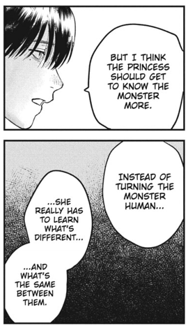 In a recent interview, the writer of the story, Mokumokuren, talked about how they approached writing it. “Ever since I was a child,” they said, “I’ve always found myself empathizing with the monsters in stories.” They talk about how disappointing it was that the Beast from Beauty and the Beast turned into a handsome man at the end, rather than being a monster wholly and fully, and the manga itself examines the idea of how monsters and humans interact.