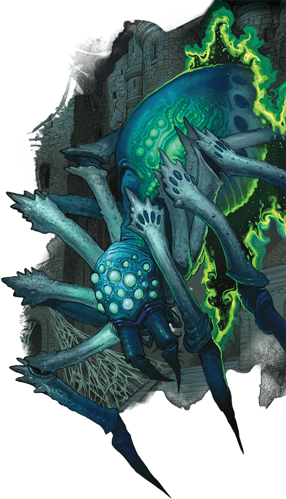 The truly terrifying thing about Phase Spiders is not just that they exist a half-step away from reality, but that there’s a whole ecosystem behind that thin, ethereal screen. From that vantage point, they can watch the Party and study its strengths and weaknesses. They have a whole territory that is inaccessible to most Players, and can use that to their advantage.